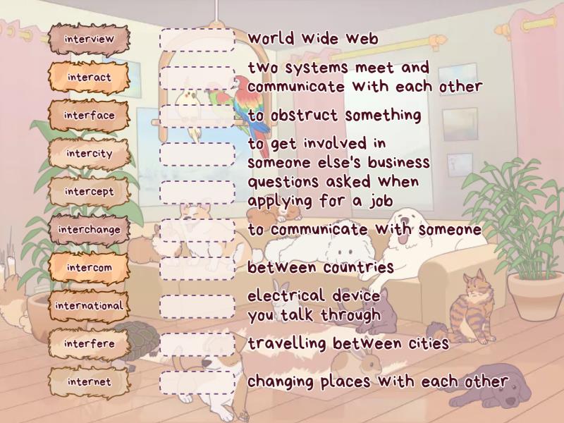 intercity - travelling between cities, interact - to communicate with someone, interface - two systems meet and communicate with each other, interchange - changing places with each other, internet - world wide web, intercom - electrical device you talk through, intercept - to obstruct something, interview - questions asked when applying for a job, interfere - to get involved in someone else's business, international - between countries,