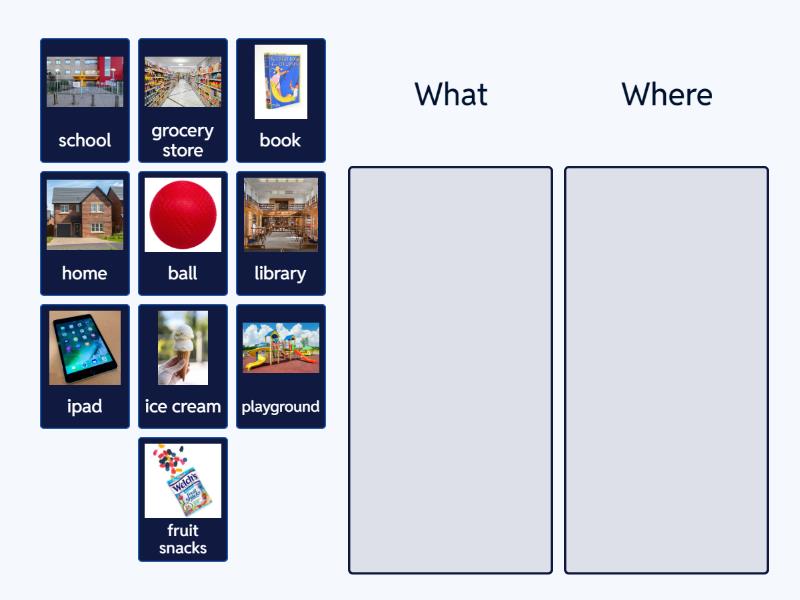 What: ball, book, ice cream, ipad, fruit snacks, Where: school, playground, home, grocery store, library,
