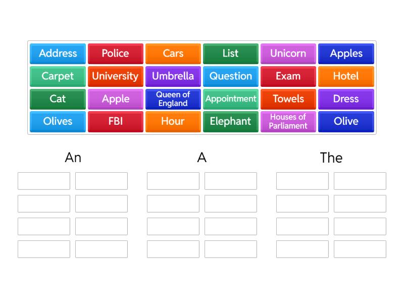 An: Apple, Elephant, Olive, Appointment, Address, Hour, Umbrella, Exam, A: Cat, Unicorn, Hotel, Dress, University, Carpet, Question, List, The: Apples, Olives, Towels, Cars, Queen of England, Houses of Parliament, FBI, Police,