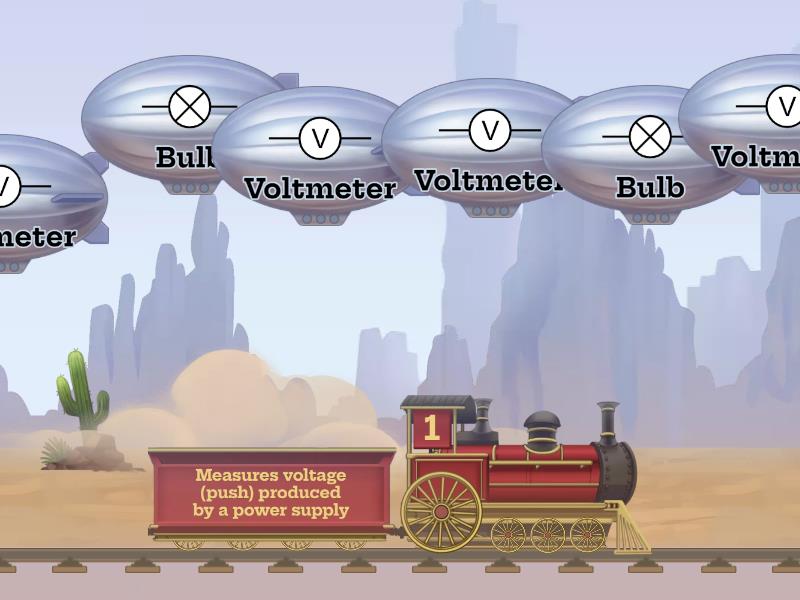 Bulb - Glows brightly when connected, Voltmeter - Measures voltage (push) produced by a power supply, Ammeter - Measures flow of electricity (current), Resistor - Decreases the amount of electrical current, Battery - Changes chemical energy into electrical energy, Opened switch - There is a gap, so electricity cannot flow, Closed switch - The circuit is complete so electricity can flow, Motor - Changes electrical energy into movement (kinetic) energy, Wire - Connects different components together, Buzzer - Changes electrical energy into sound and movement energy,