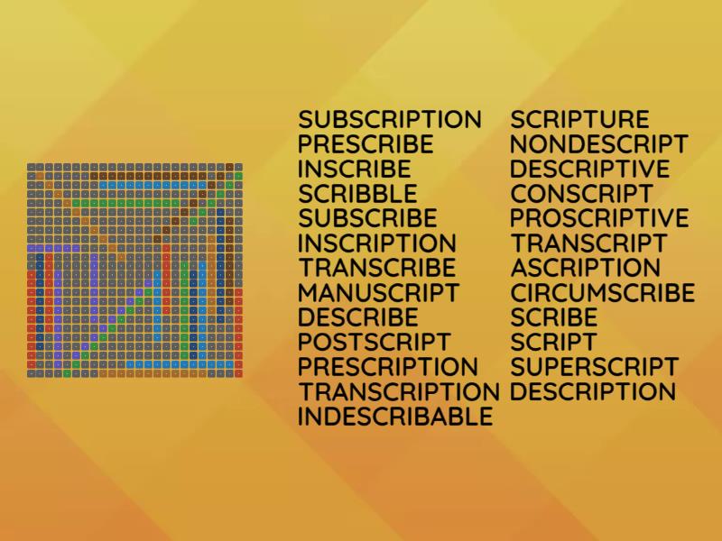 subscription, prescribe, inscribe, scribble, subscribe, inscription, transcribe, manuscript, describe, postscript, prescription, transcription, indescribable, scripture, nondescript, descriptive, conscript, proscriptive, transcript, ascription, circumscribe, scribe, script, superscript, description,