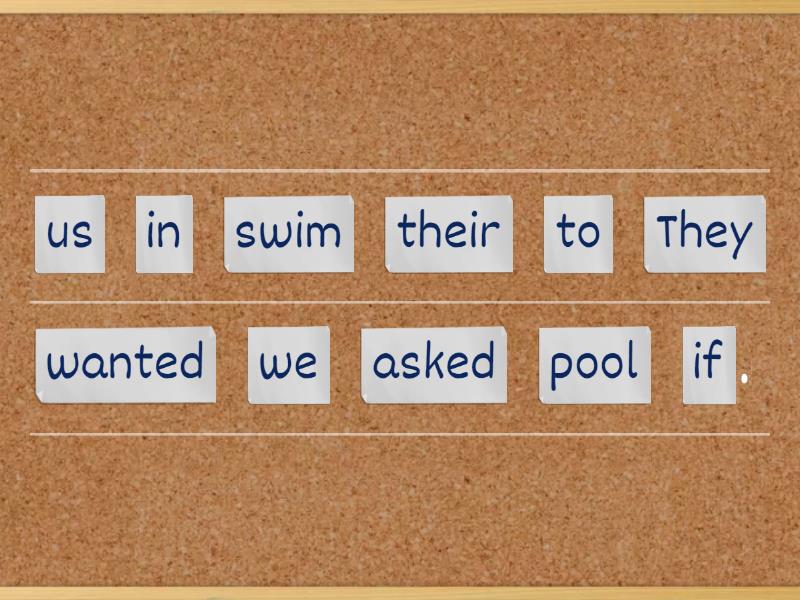 They asked us if we wanted to swim in their pool., My dad asked me to help with the washing up., My boss asked me why I had been absent yesterday., She asked me how I travelled to work., Our teacher asked us if we had done our homework., He asked me when I had last visited the UK., They asked us what we had done on holiday., John asked if I was giving the presentation., She asked me if my brother liked playing football., I asked her to come to my house on Friday., She asked if I had ever met a pop star., He asked me where I had put his car keys.,