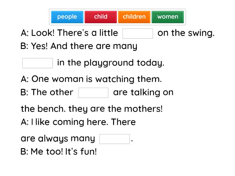 A: Look! There’s a little ____ on the swing. B: Yes! And there are many ____ in the playground today. A: One woman is watching them. B: The other ____ are talking on the bench. they are the mothers! A: I like coming here. There are always many ____. B: Me too! It’s fun! A: My ____ hurts. Look, this one. B: Oh no! I hope your other ____ are okay. A: Yes, only this one. How about you? B: My ____ hurt today. A: Both ____? B: Just one! A: Look at that ____ by the pond, or is it a duck? B: It's not a duck. Look there are more ____ there. A: Do you see the big ____? B: Yes, and these little sheep too. A: This farm has many animals. B: I love it here! A: I saw a ____ in the classroom! B: Really? Sometimes there are ____ in the kitchen too. A: Oh no, and what happened to Mario? A: They found a ____ on his shoulder. B: NOOOO. I don’t want those ____ in my hair! A: Me neither! B: I hope he can get cleaned!