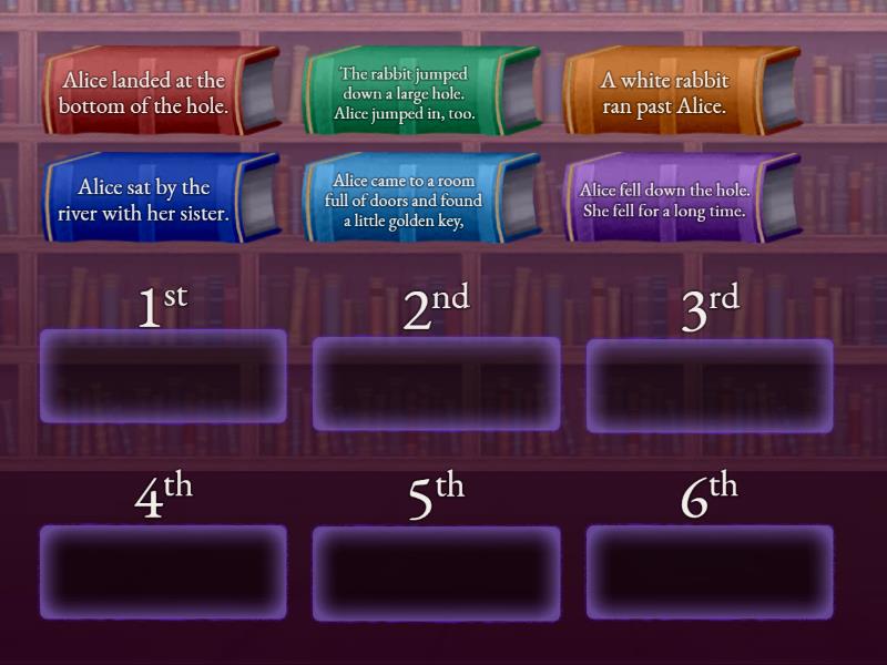 Alice sat by the river with her sister., A white rabbit ran past Alice., The rabbit jumped down a large hole. Alice jumped in, too., Alice fell down the hole. She fell for a long time., Alice landed at the bottom of the hole., Alice came to a room full of doors and found a little golden key,.