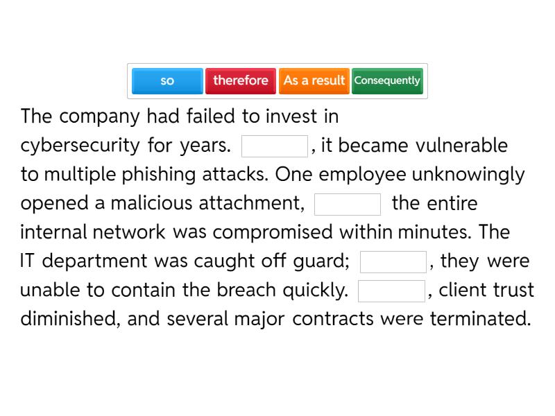 The company had failed to invest in cybersecurity for years. ____, it became vulnerable to multiple phishing attacks. One employee unknowingly opened a malicious attachment, ____ the entire internal network was compromised within minutes. The IT department was caught off guard; ____, they were unable to contain the breach quickly. ____, client trust diminished, and several major contracts were terminated.