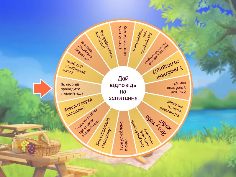 1) Яка улюблена пора року? 2) Яку країну мрієш відвідати? 3) Як любиш проводити вільний час? 4) Яка твоя улюблена книга? 5) Який твій улюблений одяг? 6) Улюблені солодощі? 7) Ким мріяв стати у дитинстві? 8) Яка професія тобі подобається? 9) З ким ти любиш проводити вільний час? 10) Твоя улюблена пісня? 11) Які іноземні мови ти вивчаєш? 12) Яке у тебе хобі? 13) Твій улюблений шкільний предмет?  14) Який твій улюблений мультик/фільм/серіал? 15) Яка твоя улюблена тваринка? 16) Фаворит серед кольорів?
