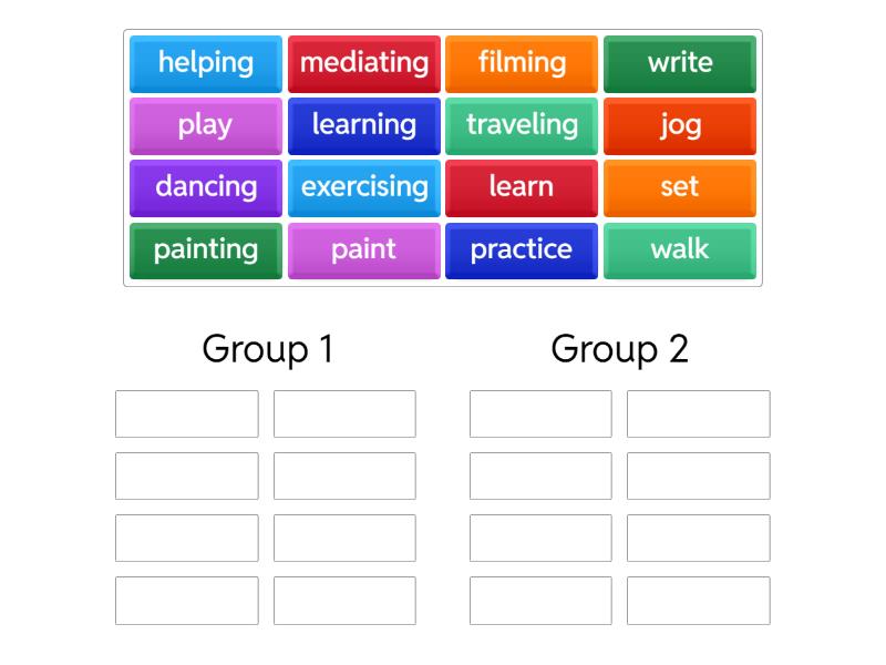 Group 1: traveling, dancing, mediating, learning, filming, exercising, painting, helping, Group 2: practice, learn, set, play, walk, jog, write, paint,