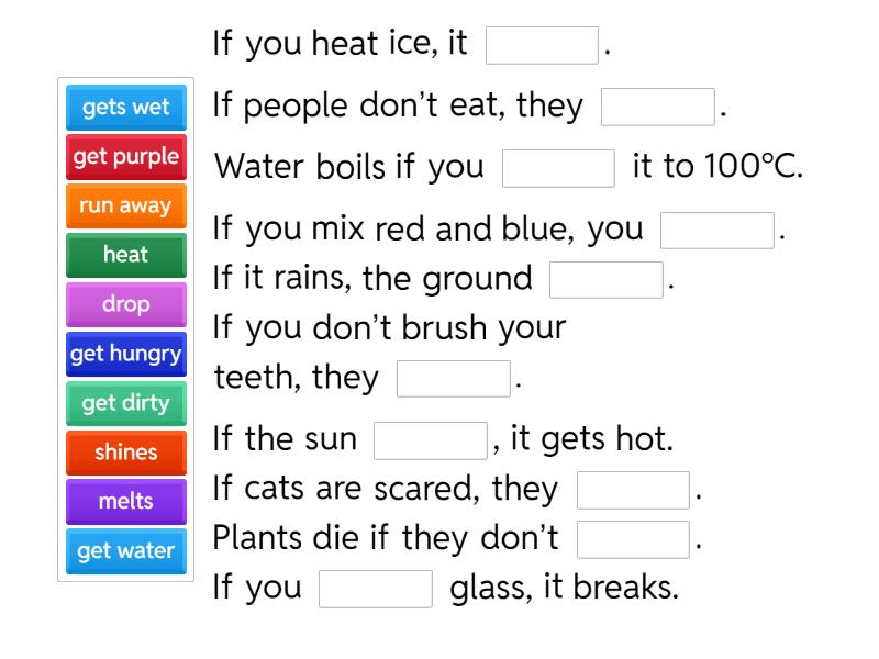 If you heat ice, it ____. If people don’t eat, they ____. Water boils if you ____ it to 100°C. If you mix red and blue, you ____. If it rains, the ground ____. If you don’t brush your teeth, they ____. If the sun ____, it gets hot. If cats are scared, they ____. Plants die if they don’t ____. If you ____ glass, it breaks.