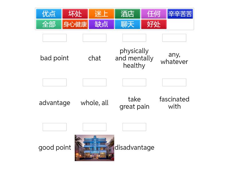 好处 - advantage, 坏处 - disadvantage, 优点 - good point, 缺点 - bad point, 酒店, 迷上 - fascinated with, 全部 - whole, all, 辛辛苦苦 - take great pain, 聊天 - chat, 身心健康 - physically and mentally healthy, 任何 - any, whatever,