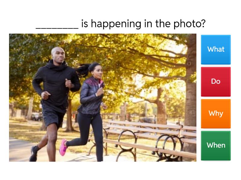 1) ________ is happening in the photo? a) What b) Do c) Why d) When 2) ________ did you choose this photo? a) Do b) Why c) What d) Who 3) ________ you like exercising? a) Do b) When c) Why d) What 4) ________ exercise do you do? a) Why b) Do c) When d) What 5) ________ do you exercise with? a) Do b) When c) Who d) Why 6) ________ do you relax? a) What b) When c) Do d) Who 7) ________ else do you like doing in your free time? a) What b) Why c) When d) Who