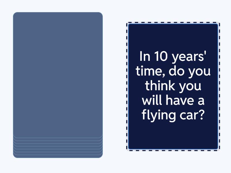 Five years from now, will you be studying a foreign language? Which one?, 10 years from now, will you have moved to another country?, Everyone is using tablets these days, so by 2030, will books have disappeared?, In 20 years' time, will robots be living with us?, By the year 2040, will the earth population have peaked at 20 billion?, In 10 years' time, do you think you will have a flying car?, By the year, 2030, will petrol vehicles have become obsolete?, In 10 years' time, will renewables have overtaken fossil fuels?, By the year 2030, will we have found life in other planets?.