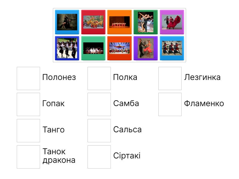 Гопак, Сіртакі, Фламенко, Самба, Полонез, Лезгинка, Танго, Сальса, Танок дракона, Полка,