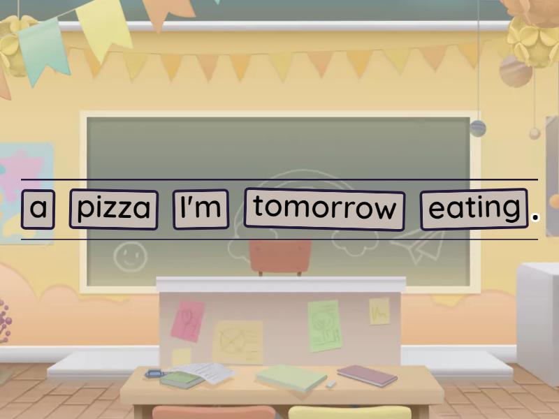 I'm eating a pizza tomorrow., Marcela is chatting with her mum today., They aren't playing football after dinner. , My dad is cooking for my birthday tomorrow., We're learning English next year., The dog is running today., Bianca is singing at night ., I'm not watching TV at night., Janek isn't playing the guitar today., He's getting a bus next month., My friends are doing homework after school.,