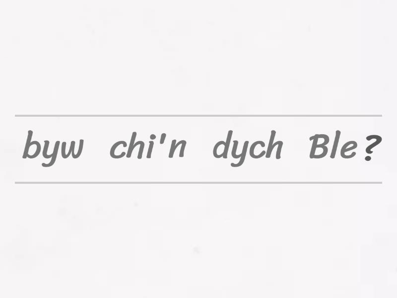 Ble dych chi'n byw?, Sut dych chi?, Da iawn, diolch., Ble dych chi'n dysgu Cymraeg?, Pwy dych chi?, Sut wyt ti?, Mohammed dw i., Yuliia dw i., Bore da. Sut dych chi?, Prynhawn da. Sut wyt ti?, Noswaith dda. Shw mae?,