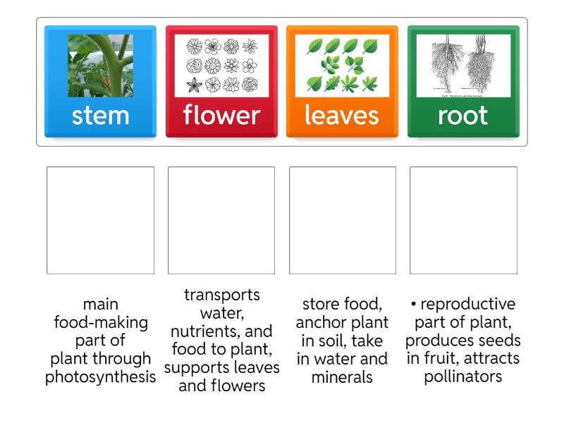 flower - • reproductive part of plant, produces seeds in fruit, attracts pollinators , leaves - main food-making part of plant through photosynthesis, stem - transports water, nutrients, and food to plant, supports leaves and flowers, root - store food, anchor plant in soil, take in water and minerals,