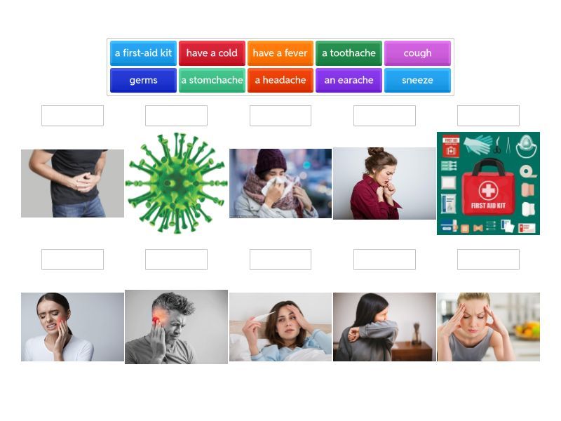 a toothache, an earache, a headache, a stomchache, have a cold, have a fever, sneeze, cough, a first-aid kit, germs,