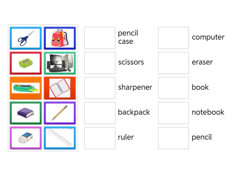 notebook, computer, scissors, eraser, backpack, pencil case, book, pencil, ruler, sharpener,