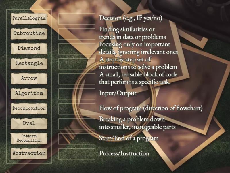 Oval - Start/End of a program, Parallelogram - Input/Output, Rectangle - Process/Instruction, Diamond - Decision (e.g., IF yes/no), Arrow - Flow of program (direction of flowchart), Decomposition - Breaking a problem down into smaller, manageable parts, Abstraction - Focusing only on important details, ignoring irrelevant ones, Pattern Recognition - Finding similarities or trends in data or problems, Algorithm - A step-by-step set of instructions to solve a problem, Subroutine - A small, reusable block of code that performs a specific task.,