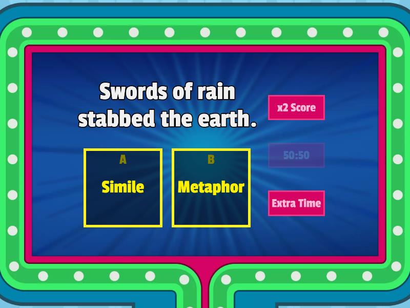 1) Swords of rain stabbed the earth. a) Simile b) Metaphor 2) Her life was like a swiftly rushing stream. a) Simile b) Metaphor 3) The students stood as still as stumps. a) Simile b) Metaphor 4) The musicians spun great webs of sound. a) Simile b) Metaphor 5) The moon is a heavy pot of gold. a) Simile b) Metaphor 6) My thoughts are passing clouds. a) Simile b) Metaphor 7) The coins gleam like cold snake scales. a) Simile b) Metaphor 8) The night is as cold as a sharp sword. a) Simile b) Metaphor 9) White clouds chase each other like scampering rabbits. a) Simile b) Metaphor 10) We were crushed by the hammer of sunlight. a) Simile b) Metaphor