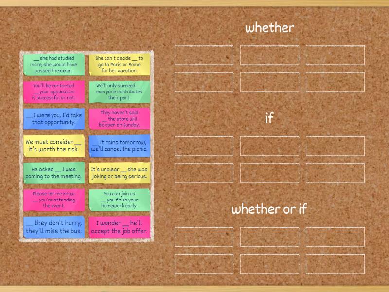 whether: She can’t decide __ to go to Paris or Rome for her vacation., It’s unclear __ she was joking or being serious., We must consider __ it’s worth the risk., You’ll be contacted __ your application is successful or not., if: __ it rains tomorrow, we’ll cancel the picnic., You can join us __ you finish your homework early., __ she had studied more, she would have passed the exam., __ they don’t hurry, they’ll miss the bus., __ I were you, I’d take that opportunity., We’ll only succeed __ everyone contributes their part., whether or if: He asked __ I was coming to the meeting., I wonder __ he’ll accept the job offer., Please let me know __ you’re attending the event., They haven’t said __ the store will be open on Sunday.,