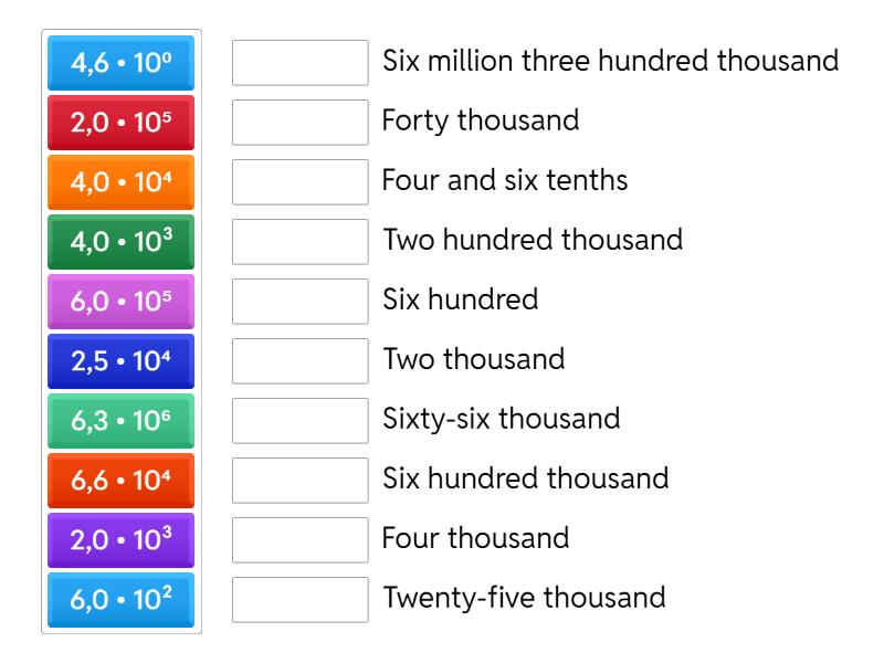 2,0 • 10³   - Two thousand  , 2,5 • 10⁴   - Twenty-five thousand , 2,0 • 10⁵   - Two hundred thousand , 4,6 • 10⁰   - Four and six tenths , 4,0 • 10³   - Four thousand , 4,0 • 10⁴   - Forty thousand , 6,0 • 10²   - Six hundred , 6,6 • 10⁴   - Sixty-six thousand , 6,0 • 10⁵   - Six hundred thousand , 6,3 • 10⁶ - Six million three hundred thousand,