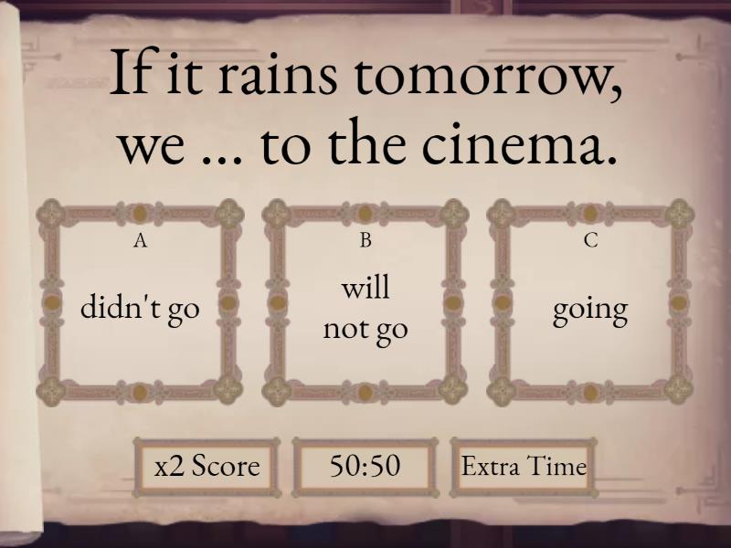1) If it rains tomorrow, we ... to the cinema.  a) didn't go b) will not go c) going 2) If Maria has a headache, ... her a medicine. a) I'll give b) I would give c) I am giving 3) I'll make you some coffee if a) you ask me b) you will ask c) you asked me 4) If Mary is late again a) I'll be angry b) I am angry c) I would be angry 5) You will miss the bus if a) you would not hurry b) you will not hurry c) you don't hurry 6) If I have enough money next week, a) I'd buy a scooter b) I'll buy a scooter c) I bought a scooter 7) If I see her tomorrow, a) I give her the gift b) I'm giving her the gift c) I'll give her the gift 8) If Kate and Sarah meet us tomorrow, a) we will ask them about this problem. b) we would ask them about the problem. c) we ask them about the problem. 9) I'll give her the flowers, a) if she will like them. b) if she is liking them. c) if she likes them. 10) You will pass the test if a) you study hard. b) you will study hard. c) you will be studying hard. 11) He will apologize if a) he sees us. b) he will see us. c) he would see us.