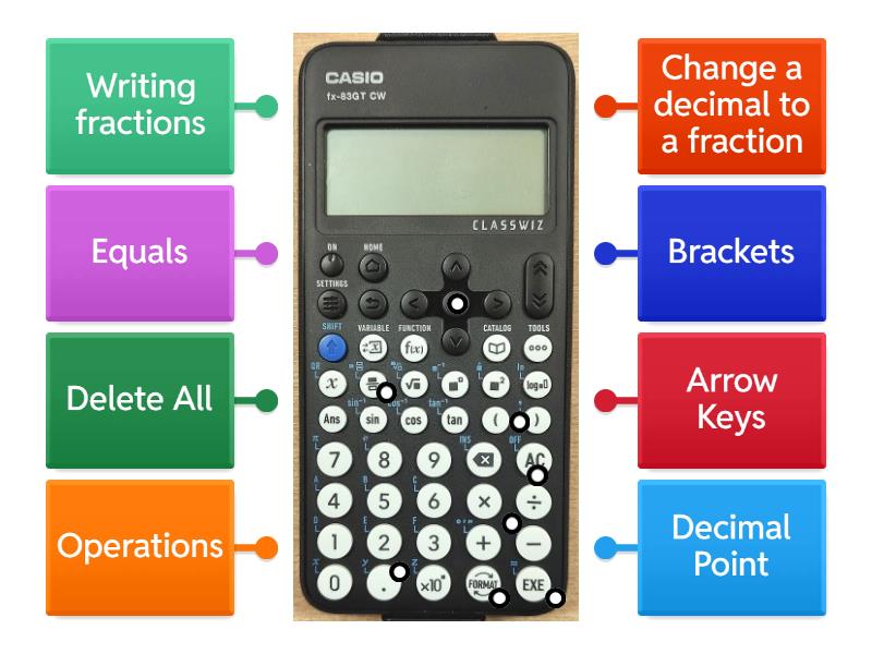 Decimal Point, Arrow Keys, Operations, Delete All, Equals, Brackets, Writing fractions, Change a decimal to a fraction.
