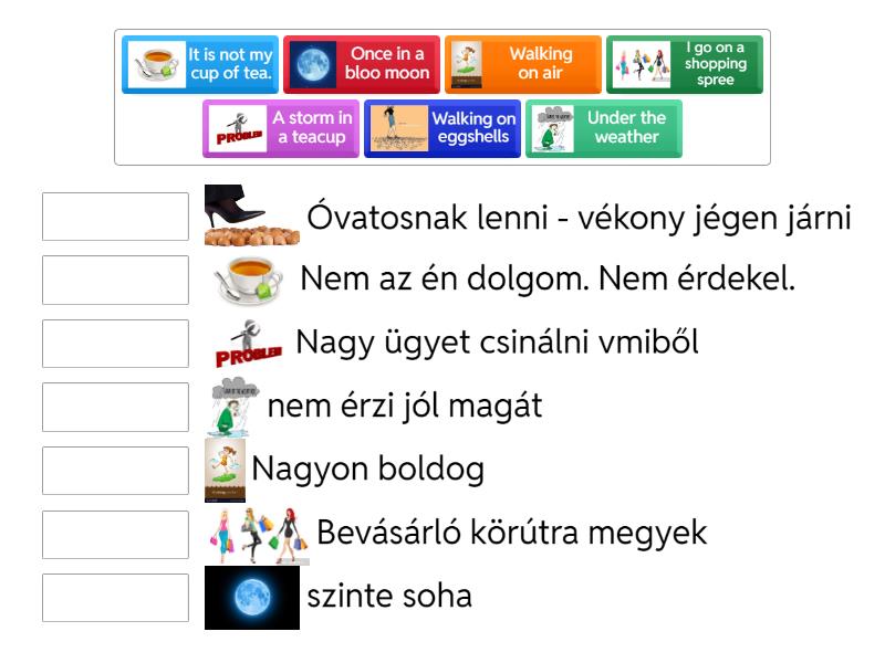 Once in a bloo moon - szinte soha, Under the weather - nem érzi jól magát, I go on a shopping spree - Bevásárló körútra megyek, A storm in a teacup - Nagy ügyet csinálni vmiből, It is not my cup of tea. - Nem az én dolgom. Nem érdekel., Walking on air - Nagyon boldog, Walking on eggshells - Óvatosnak lenni - vékony jégen járni,