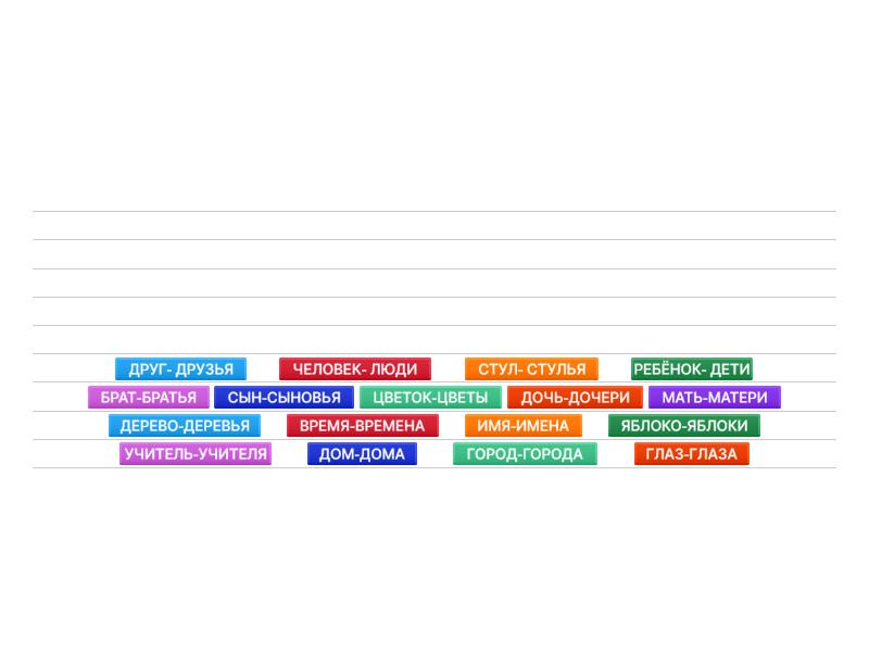 ДРУГ- ДРУЗЬЯ, ЧЕЛОВЕК- ЛЮДИ, СТУЛ- СТУЛЬЯ, РЕБЁНОК- ДЕТИ, БРАТ-БРАТЬЯ, СЫН-СЫНОВЬЯ, ЦВЕТОК-ЦВЕТЫ, ДОЧЬ-ДОЧЕРИ, МАТЬ-МАТЕРИ, ДЕРЕВО-ДЕРЕВЬЯ, ВРЕМЯ-ВРЕМЕНА, ИМЯ-ИМЕНА, ЯБЛОКО-ЯБЛОКИ, УЧИТЕЛЬ-УЧИТЕЛЯ, ДОМ-ДОМА, ГОРОД-ГОРОДА, ГЛАЗ-ГЛАЗА.