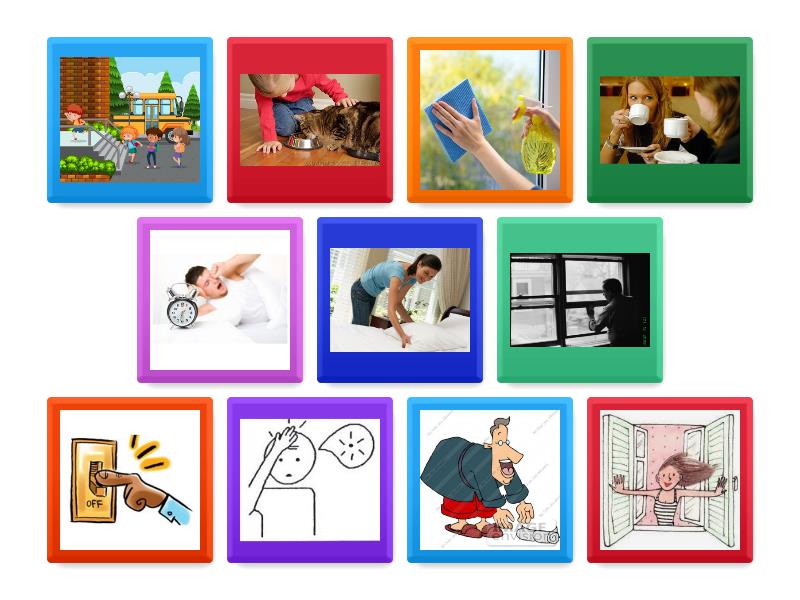 switch off - , clean -, close the window -, open the window -, pick up -, arrive -, wake up - woke up, forget - forgot , feed the cat - fed the cat, make the bed - made the bed, drink tea - drank tea,