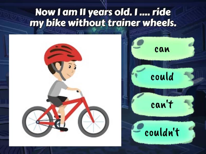 1) Now I am 11 years old. I .... ride my bike without trainer wheels. a) can b) could c) can't d) couldn't 2) Most birds .... fly. a) can b) can't c) couldn't 3) When my cat was born, he ...... run. a) couldn't b) could c) can 4) Because I am not old enough, I .... drive a car. a) can't b) can c) could d) couldn't 5) Ann learned gymnastics at six, she ... do somersaults before that. a) could b) couldn't c) can d) can't 6) Peter learned rugby at school, now he ... play professionally. a) couldn't b) can c) can't d) could 7) Now my brother ..... jump the rope in one foot. a) can b) could c) couldn't 8) Messi's dog .... catch the ball when I threw it. a) can b) couldn't c) can't 9) When Tom was 16, he was a fast runner. He _____ run 200 meters in 22 seconds. a) could b) can c) can't d) couldn't 10) He is smart. He _____ speak English, Spanish, and French! a) can b) can't c) could d) couldn't