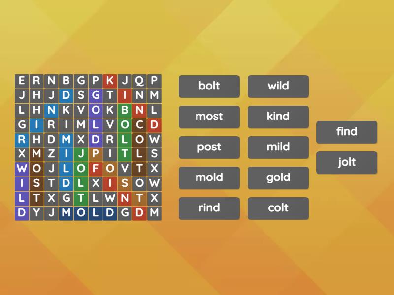 jolt - jolt, gold - gold, find - find, rind - rind, most - most, mold - mold, post - post, bolt - bolt, wild - wild, kind - kind, mild - mild, colt - colt,
