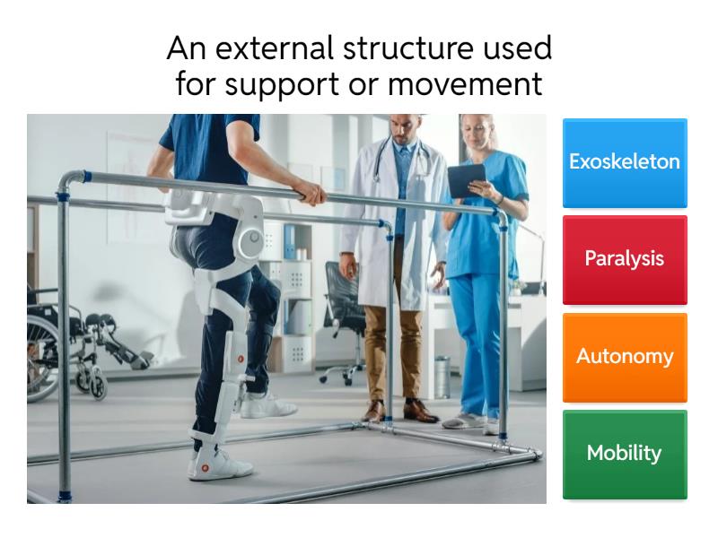 1) An external structure used for support or movement a) Exoskeleton b) Paralysis c) Autonomy d) Mobility 2) Loss of movement a) Paralysis b) Apprehensions c) Integrated d) Caregivers 3) Making your own decisions a) Caregivers b) Assistive c) Apprehensions d) Autonomy