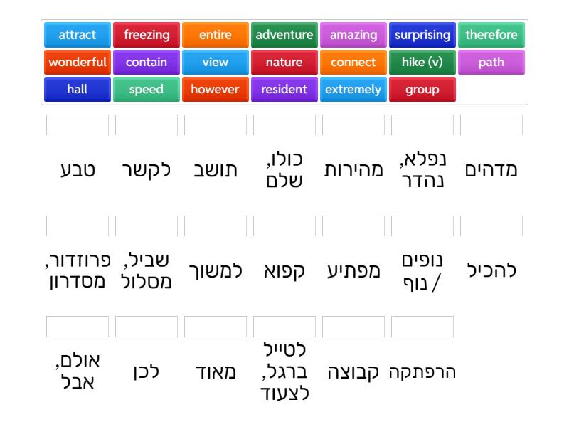 adventure - הרפתקה, amazing - מדהים, attract - למשוך, connect - לקשר, contain - להכיל, entire - כולו, שלם, extremely - מאוד, freezing - קפוא, group - קבוצה, hall - פרוזדור, מסדרון, hike (v) - לטייל ברגל, לצעוד, however - אולם, אבל, nature - טבע, path - שביל, מסלול, resident - תושב, speed - מהירות, surprising - מפתיע, therefore - לכן, view - נופים / נוף, wonderful - נפלא, נהדר,