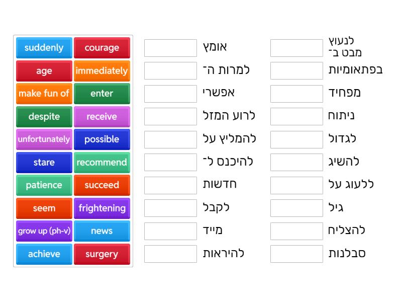 achieve - להשיג, age - גיל, courage - אומץ, despite - למרות ה־, enter - להיכנס ל־, frightening - מפחיד, grow up (ph-v) - לגדול, immediately - מייד, make fun of - ללעוג על, news - חדשות, patience - סבלנות, possible - אפשרי, receive - לקבל, recommend - להמליץ על, seem - להיראות, stare - לנעוץ מבט ב־, succeed - להצליח, suddenly - בפתאומיות, surgery - ניתוח, unfortunately - לרוע המזל,