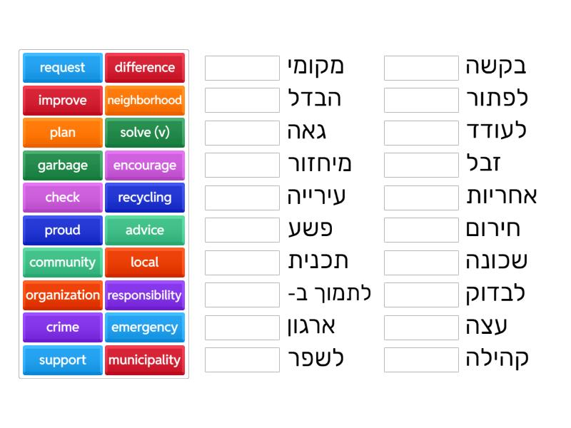 advice - עצה, check - לבדוק, community - קהילה, crime - פשע, difference - הבדל, emergency - חירום, encourage - לעודד, garbage - זבל, improve - לשפר, local - מקומי, municipality - עירייה, neighborhood - שכונה, organization - ארגון, plan - תכנית, proud - גאה, recycling - מיחזור, request - בקשה, responsibility - אחריות, solve (v) - לפתור, support - לתמוך ב-,