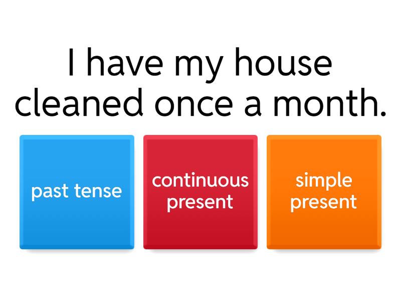 1) I have my house cleaned once a month. a) past tense b) continuous present c) simple present 2) He got his laptop fixed yesterday. a) past tense b) continuous present c) simple present 3) She is having her watch repaired while she eats lunch. a) past tense b) continuous present c) simple present 4) They get their shoes repaired at the same shop. a) past tense b) continuous present c) simple present 5) The elderly man is getting his lawn mowed by volunteers today. a) past tense b) continuous present c) simple present 6) They had their teeth cleaned at the dentist. a) past tense b) continuous present c) simple present