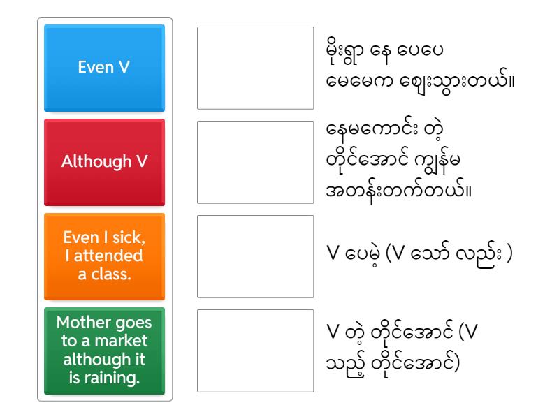 Although V - V ပေမဲ့ (V သော် လည်း ), Even V - V တဲ့ တိုင်အောင် (V သည့် တိုင်အောင်), Even I sick, I attended a class. - နေမကောင်း တဲ့ တိုင်အောင် ကျွန်မ အတန်းတက်တယ်။, Mother goes to a market although it is raining. - မိုးရွာ နေ ပေပေ မေမေက စျေးသွားတယ်။,