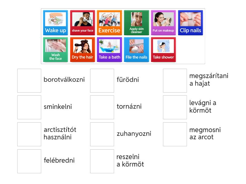 Wake up - felébredni, Wash the face - megmosni az arcot, Put on makeup - sminkelni, Exercise - tornázni, Take shower - zuhanyozni, Apply skin cleanser - arctisztítót használni, File the nails - reszelni a körmöt, shave your face - borotválkozni, Take a bath - fürödni, Dry the hair - megszárítani a hajat, Clip nails - levágni a körmöt,
