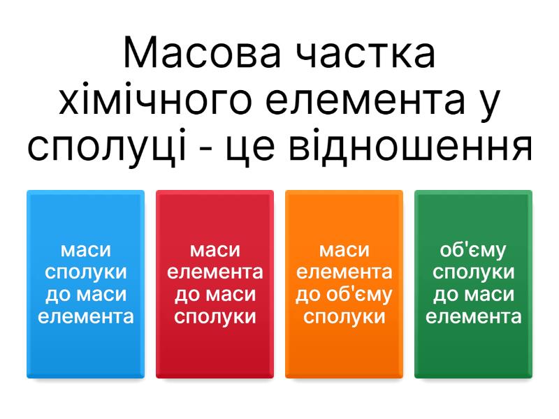 1) Масова частка хімічного елемента у сполуці - це відношення a) маси сполуки до маси елемента b) маси елемента до маси сполуки c) маси елемента до об'єму сполуки d) об'єму сполуки до маси елемента 2) Масова частка хімічного елемента має позначення a) m (E) b) Mr (E) c) M (E) d) w (E) 3) Масова частка може бути виражена a) у грамах або відсотках b) у молях або відсотках c) у відсотках або частках від 1 d) у грамах або частках від 1 4) У 40 г речовини міститься 32 г Карбону. Яка масова частка цього елемента у речовині? a) 80 % b) 8 % c) 12,5 % d) 1,25 % 5) Виберіть речовину, в якій масова частка першого у формулі елемента менша, ніж другого a) B2O3 b) ZnO c) Al2O3 d) MgO 6) Укажіть масову частку Гідрогену в речовині, формула якої С4Н6 a) 10,11 % b) 10,22 % c) 11,11 % d) 88,80 % 7) Обчисліть масову частку Кальцію у складній речовині Ca3P2 a) 34 % b) 66 % c) 30 % d) 6,6 % 8) Вкажіть формулу речовини, масові частки елементів у якій становлять: Нітрогену 63,64 %, Оксигену 36,36 % a) NO b) NO2 c) N2O d) N2O5 9) Масова частка Феруму в певній сполуці становить 30 %. У якій масі сполуки міститься 90 г Феруму? a) 300 г b) 150 г c) 200 г d) 600 г 10) Масова частка Карбону у глюкозі С6Н12О6 становить (в частках від одиниці) a) 0,8 b) 0,4 c) 0,88 d) 0,44