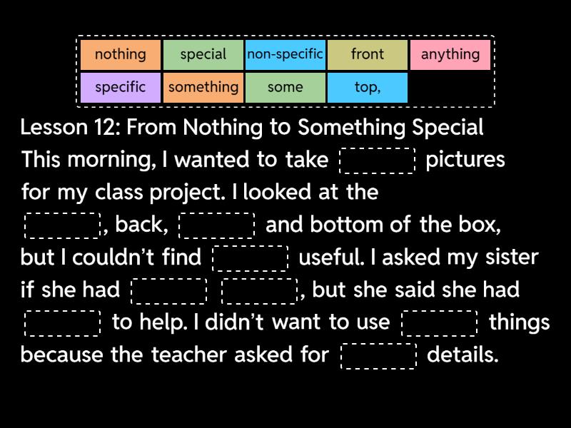 Lesson 12: From Nothing to Something Special This morning, I wanted to take ____ pictures for my class project. I looked at the ____, back, ____ and bottom of the box, but I couldn’t find ____ useful. I asked my sister if she had ____ ____, but she said she had ____ to help. I didn’t want to use ____ things because the teacher asked for ____ details. I ____ outside and saw a beautiful ____ coming from the ____ of the house. It made the flowers shine. I took a nice picture of it. Then I noticed a strange ____ from the garden. It wasn’t bad, just different. I didn’t know ____ it was, but it gave my project more feeling. I decided to write the ____ of the place where I took the photo. It’s on Green ____, near my home. Even though I didn’t plan it, I found something better than expected. Sometimes when you think there’s ____, you can still find ____ special.