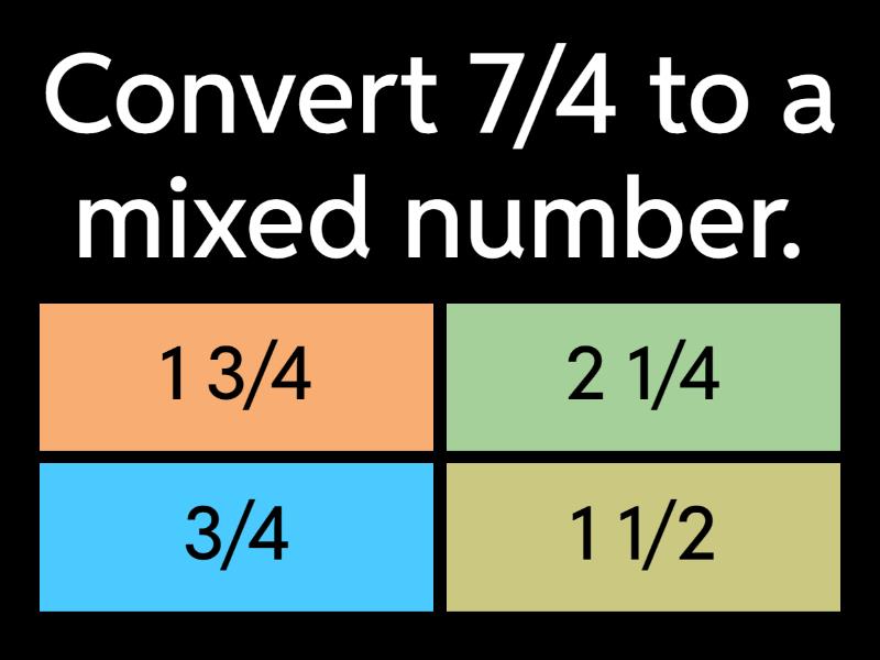 1) Convert 7/4 to a mixed number. a) 1 3/4 b) 2 1/4 c) 3/4 d) 1 1/2 2) Convert 3 2/5 to an improper fraction. a) 17/5 b) 15/5 c) 18/5 d) 16/5 3) Convert 9/2 to a mixed number. a) 4 1/2 b) 5 1/2 c) 3 1/2 d) 4 2/2 4) Convert 2 3/4 to an improper fraction. a) 11/4 b) 10/4 c) 9/4 d) 12/4 5) Convert 11/3 to a mixed number. a) 3 2/3 b) 4 1/3 c) 3 1/3 d) 2 2/3 6) Convert 5 1/6 to an improper fraction. a) 31/6 b) 30/6 c) 32/6 d) 29/6 7) Convert 14/5 to a mixed number. a) 2 4/5 b) 3 4/5 c) 2 3/5 d) 3 1/5 8) Convert 4 2/3 to an improper fraction. a) 11/3 b) 13/3 c) 15/3 d) 14/3 9) Convert 19/4 to a mixed number. a) 4 3/4 b) 5 1/4 c) 4 1/4 d) 5 3/4 10) Convert 6 5/8 to an improper fraction. a) 53/8 b) 54/8 c) 52/8 d) 51/8