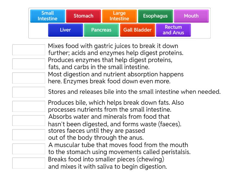 Mouth - Breaks food into smaller pieces (chewing) and mixes it with saliva to begin digestion., Esophagus - A muscular tube that moves food from the mouth to the stomach using movements called peristalsis., Stomach - Mixes food with gastric juices to break it down further; acids and enzymes help digest proteins., Small Intestine - Most digestion and nutrient absorption happens here. Enzymes break food down even more., Large Intestine - Absorbs water and minerals from food that hasn’t been digested, and forms waste (faeces)., Liver - Produces bile, which helps break down fats. Also processes nutrients from the small intestine., Gall Bladder - Stores and releases bile into the small intestine when needed., Pancreas - Produces enzymes that help digest proteins, fats, and carbs in the small intestine., Rectum and Anus - stores faeces until they are passed out of the body through the anus.,