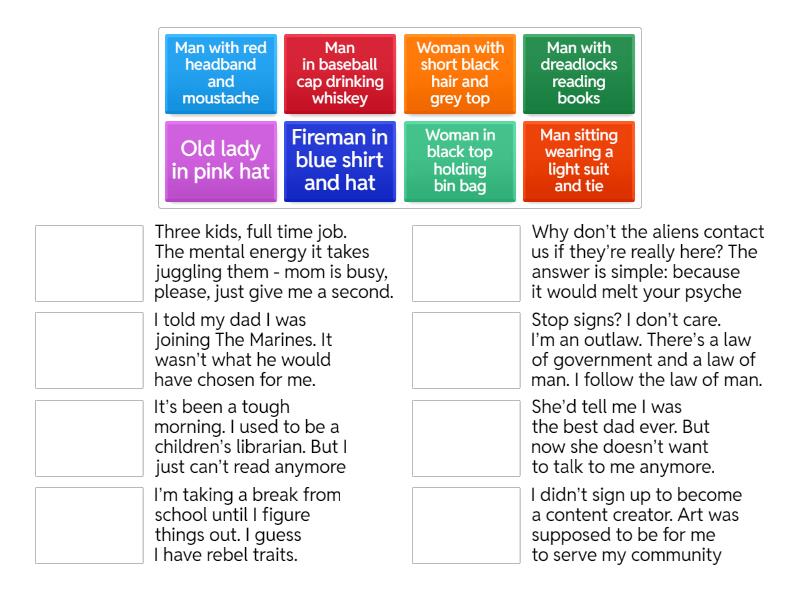 Fireman in blue shirt and hat - She’d tell me I was the best dad ever. But now she doesn’t want to talk to me anymore., Woman in black top holding bin bag - I’m taking a break from school until I figure things out. I guess I have rebel traits. , Man with red headband and moustache - Why don’t the aliens contact us if they’re really here? The answer is simple: because it would melt your psyche, Woman with short black hair and grey top - Three kids, full time job. The mental energy it takes juggling them - mom is busy, please, just give me a second., Man in baseball cap drinking whiskey - Stop signs? I don’t care. I’m an outlaw. There’s a law of government and a law of man. I follow the law of man., Man with dreadlocks reading books - I didn’t sign up to become a content creator. Art was supposed to be for me to serve my community, Man sitting wearing a light suit and tie - I told my dad I was joining The Marines. It wasn’t what he would have chosen for me., Old lady in pink hat - It’s been a tough morning. I used to be a children’s librarian. But I just can’t read anymore,