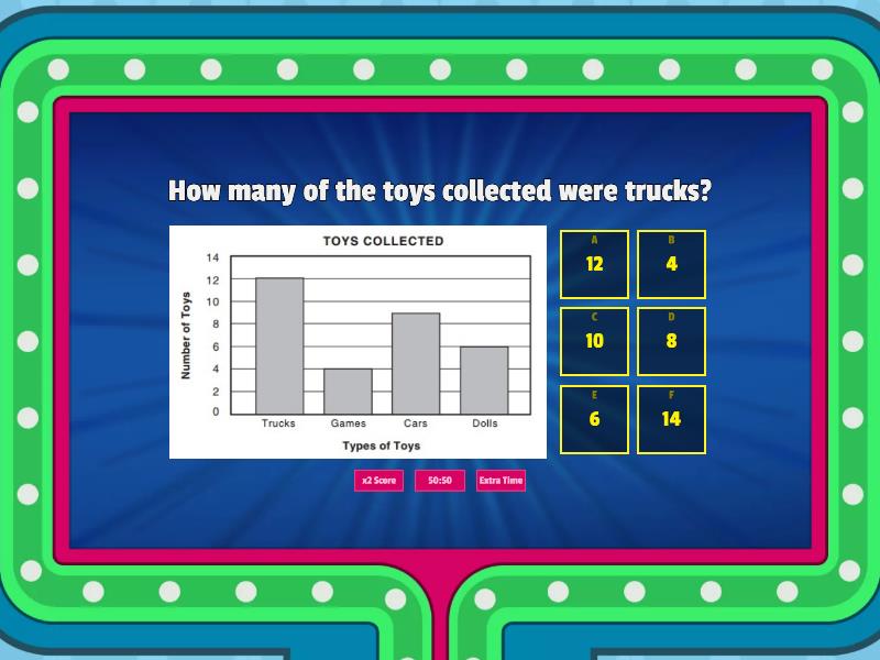 1) How many of the toys collected were trucks? a) 12 b) 4 c) 10 d) 8 e) 6 f) 14 2) How many of the toys collected were dolls? a) 12 b) 7 c) 5 d) 8 e) 6 f) 14 3) How many of the toys collected were games? a) 12 b) 4 c) 10 d) 8 e) 6 f) 14 4) How many of the toys collected were cars? a) 11 b) 7 c) 10 d) 8 e) 6 f) 9 5) What is the scale of the bar graph? (How much does each tick mark go up by) a) 1 b) 2 c) 3 d) 4 e) 5 f) 10 6) What is half of 2? a) 1 b) 2 c) 4 d) 6 e) 14 f) 10 7) How many kids said pasta was their favorite food? a) 40 b) 50 c) 35 d) 20 e) 25 f) 30 8) How many kids said pizza was their favorite food? a) 40 b) 50 c) 35 d) 20 e) 25 f) 30 9) How many kids said fries was their favorite food? a) 40 b) 50 c) 35 d) 20 e) 25 f) 30 10) How many kids said salad was their favorite food? a) 15 b) 12 c) 35 d) 20 e) 25 f) 30 11) How many kids said chicken nuggets were their favorite food? a) 40 b) 32 c) 35 d) 20 e) 25 f) 30 12) How many kids said wraps were their favorite food? a) 15 b) 12 c) 35 d) 20 e) 25 f) 30 13) How many kids in total were asked about their favorite food? a) 50 b) 180 c) 185 d) 205 e) 200 f) 195 14) What is the scale of the bar graph? (How much does each tick mark go up by) a) 50 b) 10 c) 2 d) 1 e) 5 f) 15 15) What is half of 10? a) 2 b) 20 c) 3 d) 1 e) 5 f) 4