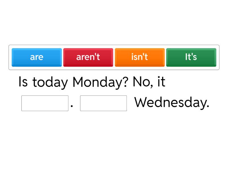Is today Monday? No, it ____. ____ Wednesday. ____ we in New York City? Yes, ____ are. Is Bad Bunny from Puerto Rico? Yes, ____ ____ . ____ your parents from Italy? No, ____ ____ . ____ the bus on time? No ____ ____ . ____ you tired? Yes, ____ ____ aren't. Is your car fast? Yes, ____ ____ .