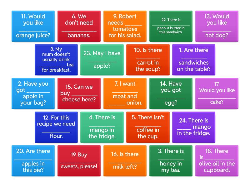 1. Are there _________ sandwiches on the table? - any, 2. Have you got ________ apple in your bag? - an, 3. There is _________ honey in my tea. - some, 4. There is _________ mango in the fridge. - a, 5. There isn't _________ coffee in the cup. - any, 6. We don't need ____________ bananas. - any, 7. I want _________ meat and ______ onion. - some / an, 8. My mum doesn't usually drink ___________ tea for breakfast. - any, 9. Robert needs ______ tomatoes for his salad. - some, 10. Is there ________ carrot in the soup? - a, 11. Would you like __________ orange juice? - some, 12. For this recipe we need __________ flour. - some, 13. Would you like __________ hot dog? - a, 14. Have you got __________ egg? - an, 15. Can we buy _________ cheese here? - any, 16. Is there ___________ milk left? - any, 17. Would you like ______________ cake? - some, 18. There is __________ olive oil in the cupboard. - some, 19. Buy ______________ sweets, please! - some, 20. Are there _____________ apples in this pie? - any, 22. There is ____________________ peanut butter in this sandwich. - some, 23. May I have __________ apple? - an, 24. There is _____ mango in the fridge. - a,