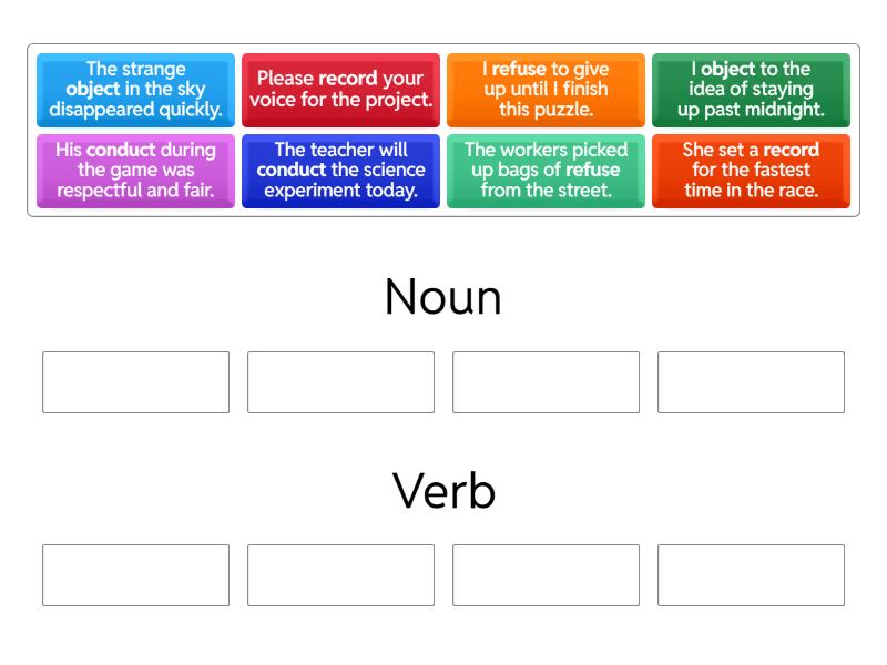 Noun: She set a record for the fastest time in the race., The strange object in the sky disappeared quickly., His conduct during the game was respectful and fair., The workers picked up bags of refuse from the street., Verb: Please record your voice for the project., I object to the idea of staying up past midnight., The teacher will conduct the science experiment today., I refuse to give up until I finish this puzzle.,
