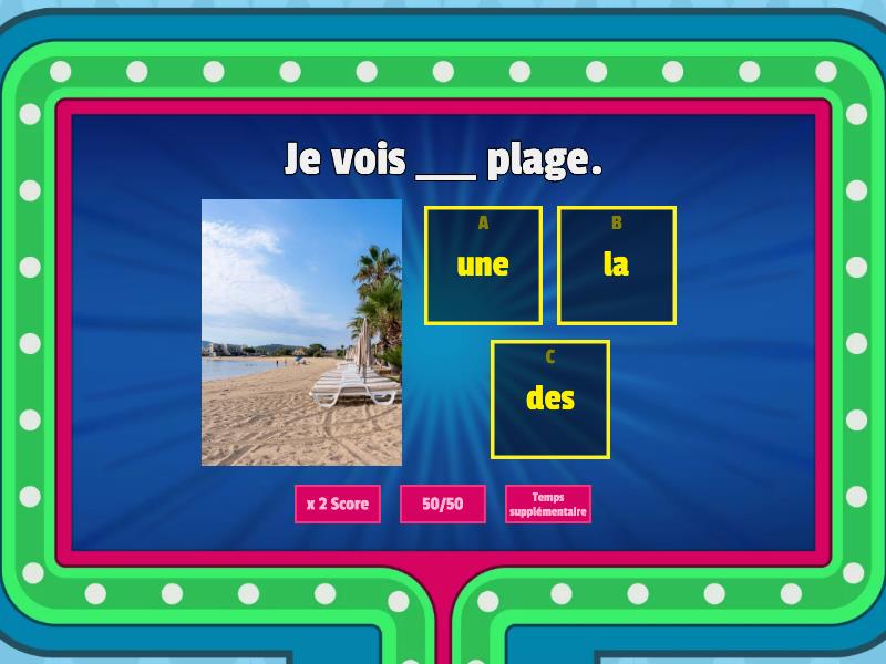 1) Je vois ___ plage. a) une b) la c) des 2) C'est ___ belle maison. a) un b) la c) une 3) Nous visitons ___ ville. La ville est trés belle. a) la b) une c) des 4) ___ appartement de Marc est grand. a) Un b) Le c) Des 5) Il y a ___ rue ici. a) une b) la c) des 6) ___ université est célèbre. a) Une b) La c) Des 7) C'est ___ quartier animé. a) un b) le c) des