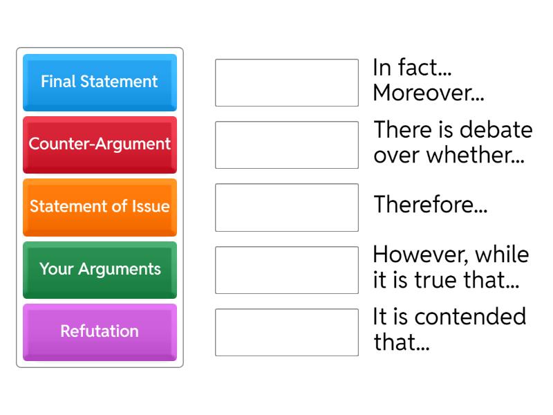 Statement of Issue - There is debate over whether..., Counter-Argument - It is contended that..., Refutation - However, while it is true that..., Your Arguments - In fact... Moreover..., Final Statement - Therefore...,